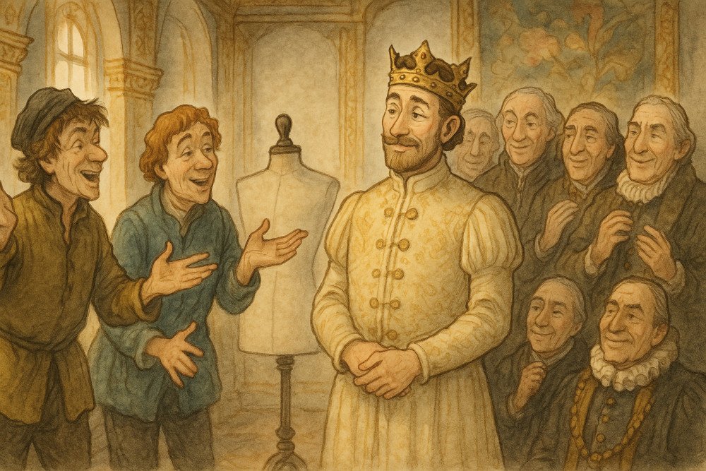 Dua penjahit cerdik memamerkan pakaian tak kasat mata kepada sang Raja. Para menteri tersenyum dan mengangguk, meski yang mereka lihat hanyalah udara kosong dan kebohongan.