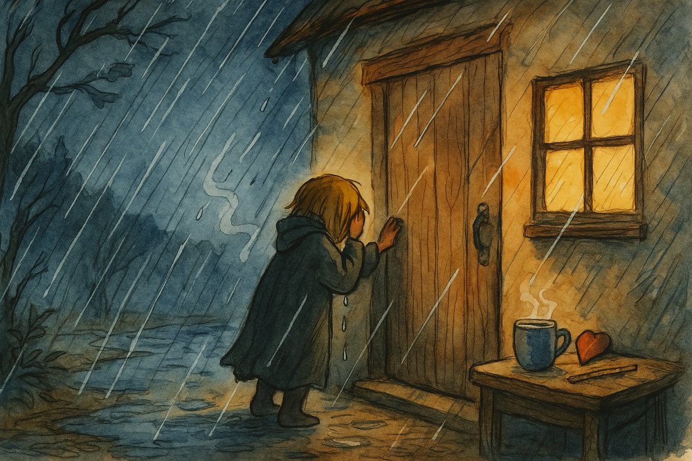 Dalam dinginnya hujan malam, seorang anak mengetuk pintu sebuah rumah hangat. Air menetes dari jubahnya, membawa serta harap akan pelukan, cahaya, dan secangkir kehangatan manusia.