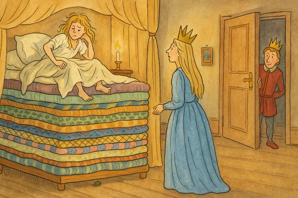 Di atas dua puluh kasur dan dua puluh bantal bulu, sang putri tidak bisa tidur. Hanya satu kacang polong kecil yang membuktikan: ia adalah seorang putri sejati.