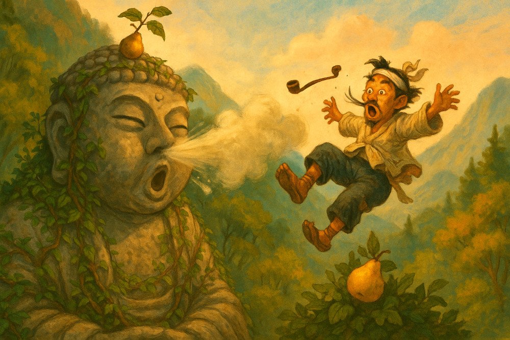 Seorang pria malas memanjat hidung patung raksasa demi buah pir—tapi tak disangka, sang patung bersin! Petualangan kocak yang tak terlupakan dimulai dari lubang hidung batu.